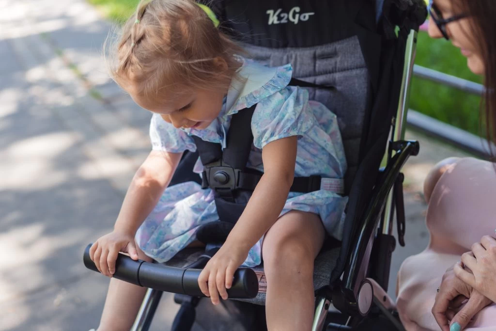 Kees K2Go ma dość obszerne siedzisko, więc bez problemu zmieścimy tam nawet większe gabarytowo dzieci. Długość oparcia wynosi 43 cm, ale odległość od siedziska do budki to 65 cm, więc nawet jeśli dziecku głowa wystaje nieco ponad oparcie, to nie zahacza głową o budkę. Hela, która ma ok. 90 cm wzrostu, lekko wystaje czubkiem głowy ponad oparcie, a Lila (110 cm) też mogła sobie całkiem wygodnie w Keesie podróżować.