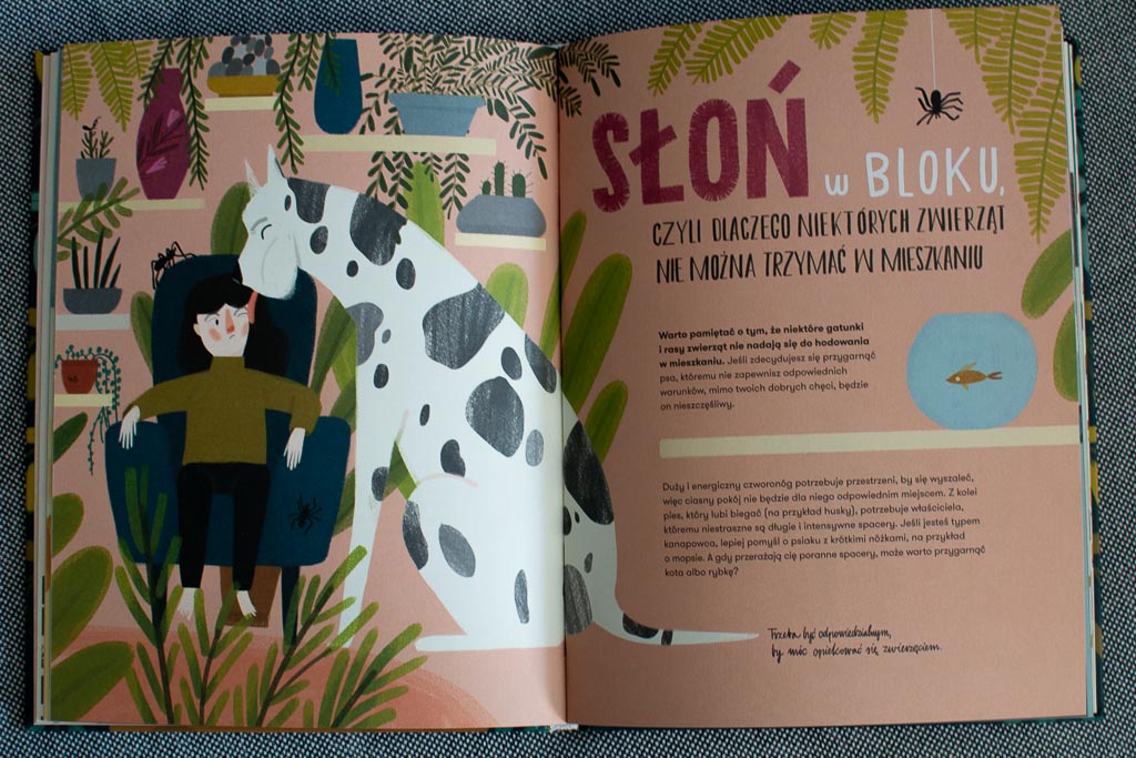 „Zwierzokracja” to tegoroczna Najlepsza Książka Dziecięca „Przecinek i Kropka” w kategorii wiekowej 6-8 lat. Przyznam szczerze, że wcześniej umknęła mi ta pozycja, a szkoda, bo to bardzo mądra książka, z której można się dowiedzieć, jak wyglądało nasze podejście do zwierząt w dawnych czasach, jak się zmieniało i co możemy zrobić, żeby zwierzęta niepotrzebnie nie cierpiały. „Zwierzokracja” niesamowicie wciąga, a dzięki temu, że każda rozkładówka to nowe zagadnienie, dowiadujemy się z niej niesamowicie dużo. Z całą pewnością książka ma szansę mieć duży wpływ na światopogląd dzieci. Kto wie, może po tej lekturze zaczną pilnować czy kupujecie jajka zerówki, zrezygnują z chodzenia do cyrku ze zwierzętami i będą chciały zrozumieć, dlaczego na święta kupujecie żywego karpia. Bardziej wrażliwe dzieci być może przejdą na wegetarianizm :)