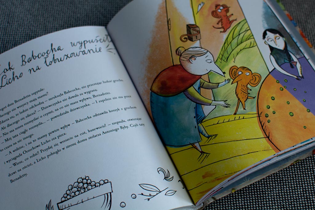 „Babcocha” to kolejna książka duetu Justyna Bednarek i Daniel de Latour! Ja jestem zakochana we wszystkich książkach tej dwójki, więc i Babcochę pokochałam od pierwszej strony. Główną bohaterką książki jest najprawdziwsza czarownica Babcocha, która pewnego dnia przylatuje do Grajdołka, trzymając się gradowej chmury i od tej chwili ma ręce pełne roboty. Leczy żaby, zamienia żołędzie w złote monety, przegania duchy i wyprowadza na ludzi co poniektórych mieszkańców Grajdołka. Książkę czyta się szybko, bo historyjki są krótkie i zabawne, do każdej z nich namalowany jest jeden obrazek. Ponieważ z założenia żadna opowiastka nie wychodzi poza jedną stronę tekstu, to niestety literki mogą być trochę za małe, jak na samodzielne czytanie dla początkujących.