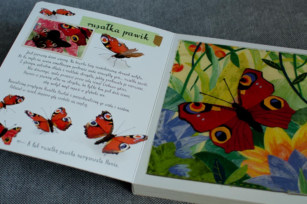 „Mały atlas motyli” to druga po „Małym atlasie ptaków” książka Ewy i Pawła Pawlaków. Atlas ptaków dostaliśmy w prezencie od dziadków i książka bardzo przypadła dzieciom do gustu. Dlatego, kiedy zobaczyłam, że Nasza Księgarnia wydała kolejny „Mały atlas”, to kupiłam go bez wahania. Powiem szczerze, że motyle zachwyciły mnie jeszcze bardziej niż ptaki i nie mogę się doczekać letnich spacerów po łąkach. W atlasie znajdziemy przedstawicieli ponad dwudziestu polskich gatunków motyli, które sportretowane są różnymi technikami plastycznymi — kolaże z tkanin, akwarele, fotografie czy modele z liści i patyków. Każdy z gatunków jest też krótko opisany, dzięki temu mali tropiciele przyrody będą wiedzieli, jakiego motyla właśnie obserwują. Świetna książka dla dzieci, a także dla rodziców, którzy bardzo chcieliby umieć odpowiedzieć na pytanie: „Co to za motylek?”.
