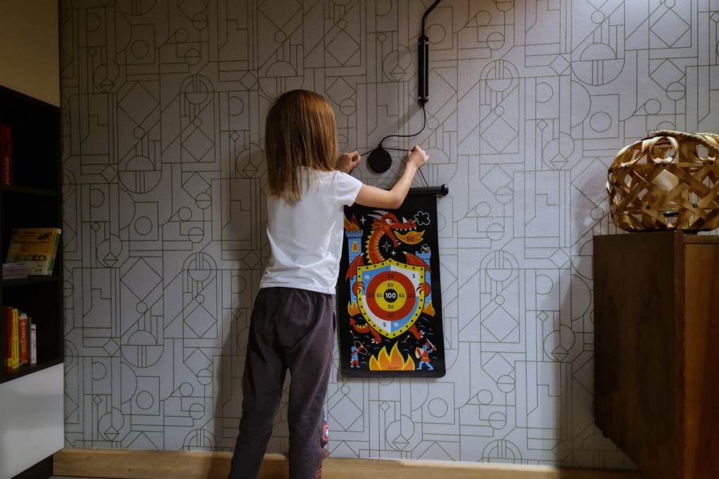 Jestem wielką fanką magnetycznych rzutek marki Janod i uważam, że to jest gra, która powinna znaleźć się w pokoju każdego przedszkolaka. Zwijana magnetyczna dwustronna tarcza może zawisnąć na przykład na drzwiach czy na ścianie w pokoju, a rzucanie do niej 6 magnetycznymi rzutkami nie wyrządzi ani dziecku, ani pokojowi żadnej krzywdy. Tarcza jest dwustronna i na każdej ze stron znajduje się inny obrazek podpisany punktami, żeby było wiadomo, gdzie należy celować. Rzutki są bezpieczne i dwukolorowe, dzięki czemu można z łatwością wprowadzić do gry element rywalizacji.