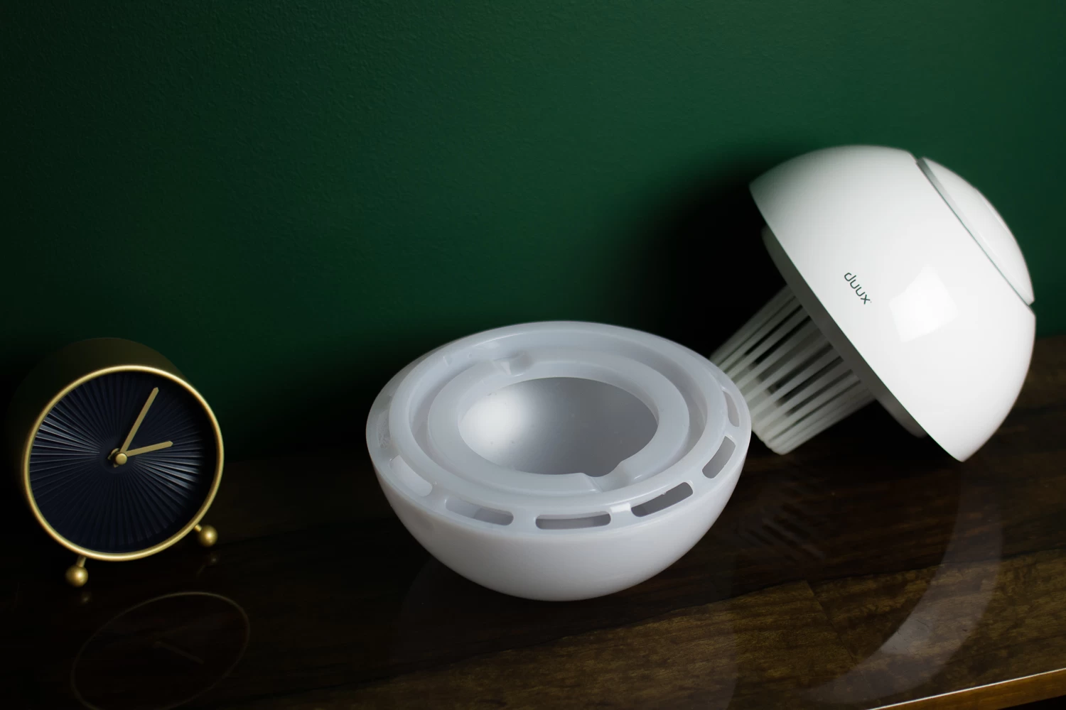 Czyszczenie Duux Sphere to bajka! Zbiornik na wodę, który jest dolną półkulą, nie ma żadnej pokrywki, więc bardzo łatwo można go umyć, docierając we wszystkie zakamarki. Nie ma więc problemu ani z wymianą wody, ani z dokładnym umyciem zbiornika raz w tygodniu. Producent zaleca czyszczenie zbiornika wodą z octem oraz używania wody destylowanej w celu zmniejszenia osadu w nawilżaczu.