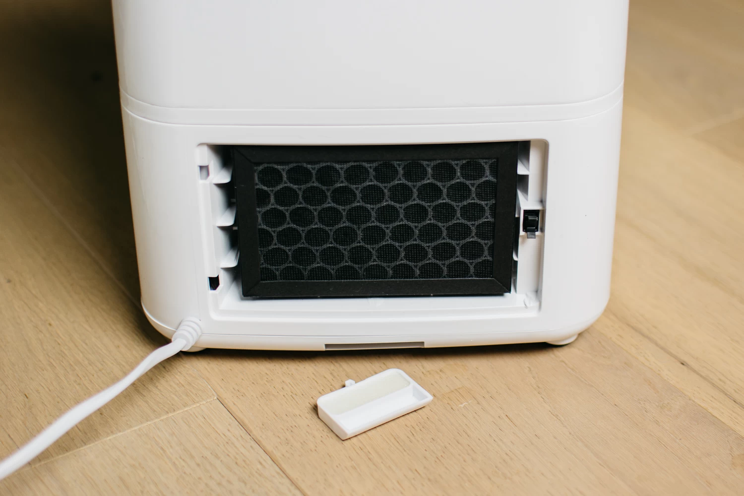 Jak już wspomniałam, ten nawilżacz ma też funkcję oczyszczania powietrza. Z tyłu urządzenia znajduje się specjalny wymienny filtr węglowy i filtr HEPA, które wyłapują zanieczyszczenia o rozmiarze większym od 0,3 μm. Oprócz wyłapywania pyłów drobnych (główny składnik smogu), takie filtry zatrzymują też bakterie, wirusy, roztocza, alergeny, pyłki roślinne czy kurz, co zdecydowanie poprawia jakość powietrza w pomieszczeniu, w którym stoi oczyszczacz.