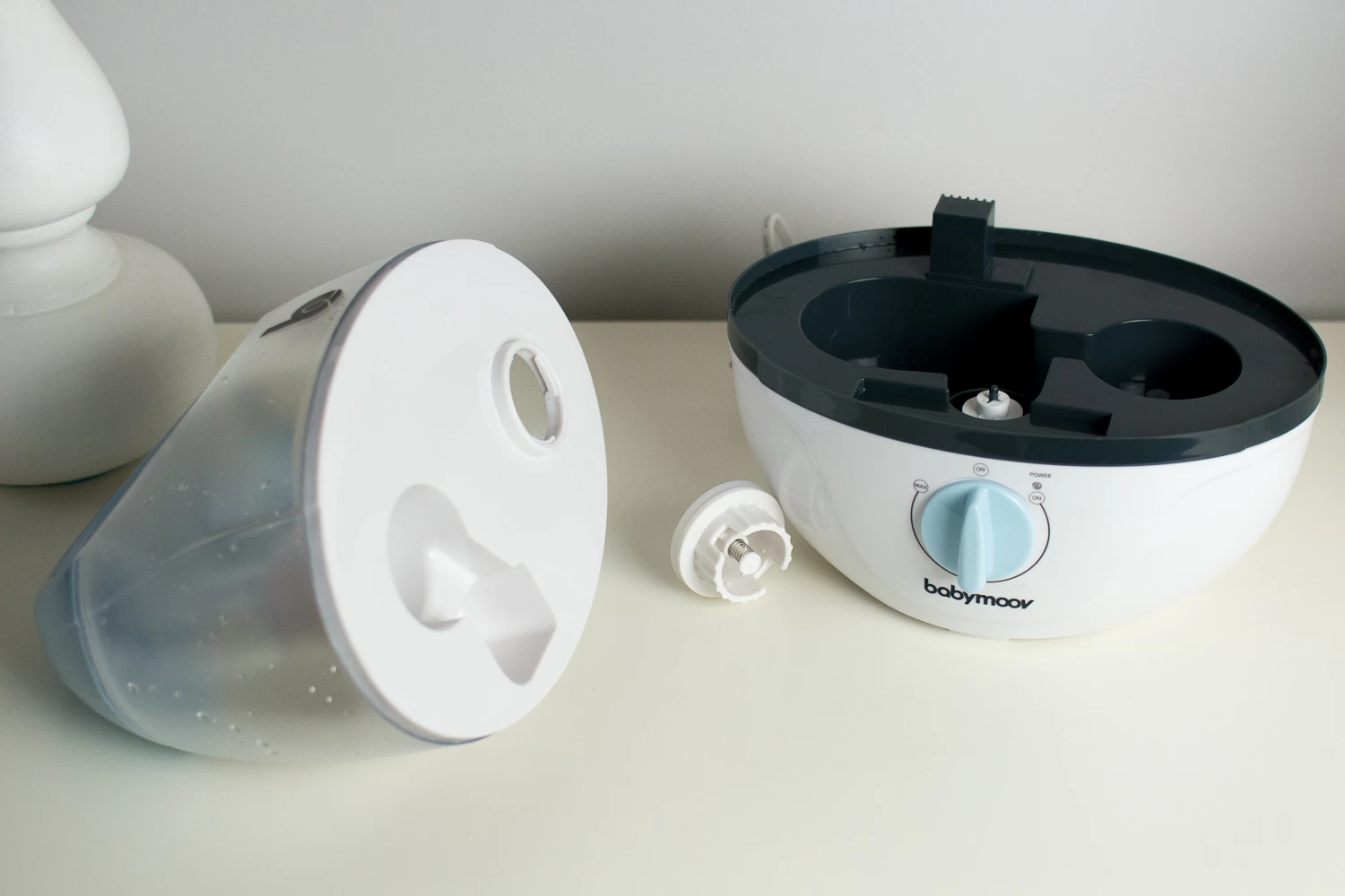 Woda w nawilżaczu powinna być regularnie wymieniania (raz na 3 dni), a raz w tygodniu powinniśmy wyczyścić cały nawilżacz. Tak częste czyszczenie sprawi, że nawilżacz będzie dłużej sprawny, a para wodna wydobywająca się z nawilżacza będzie czysta. Czyszczenie zbiornika na wodę w nawilżaczu Babymoov Hygro+ nie jest proste, bo dostęp do jego wnętrza jest utrudniony — wyczyszczenie go szczotką jest niemożliwe, bo jest tam tylko jeden otwór. Dlatego najlepiej jest co jakiś czas ten zbiornik przepłukać wodą z chlorem (mieszanką do czyszczenia wody pitnej).