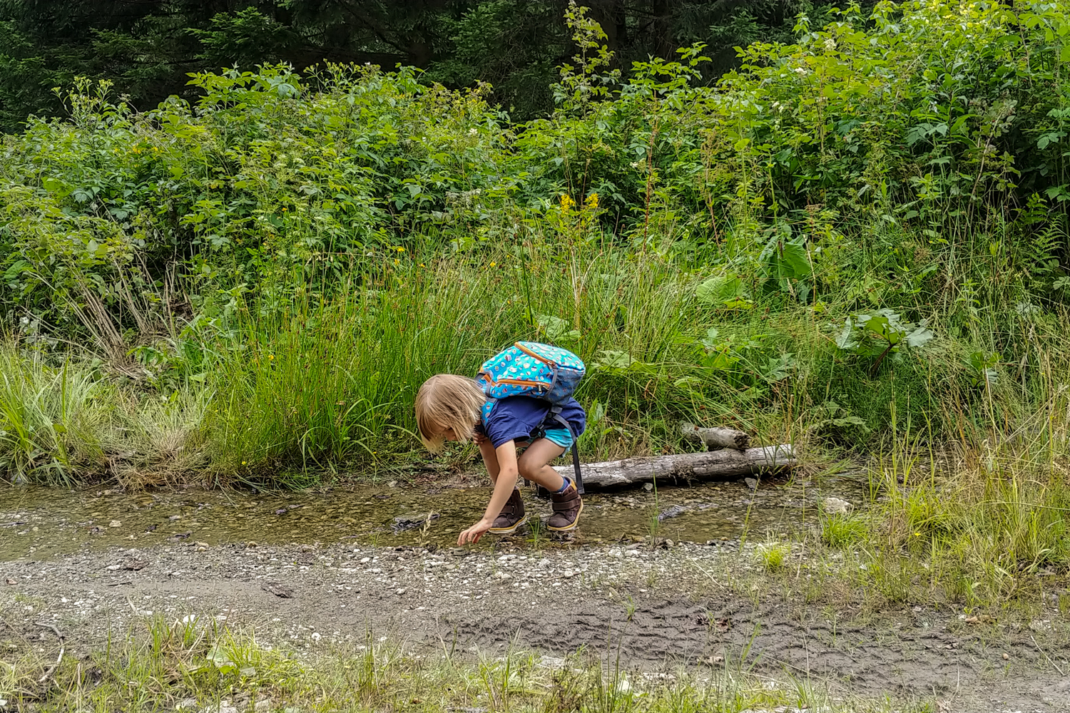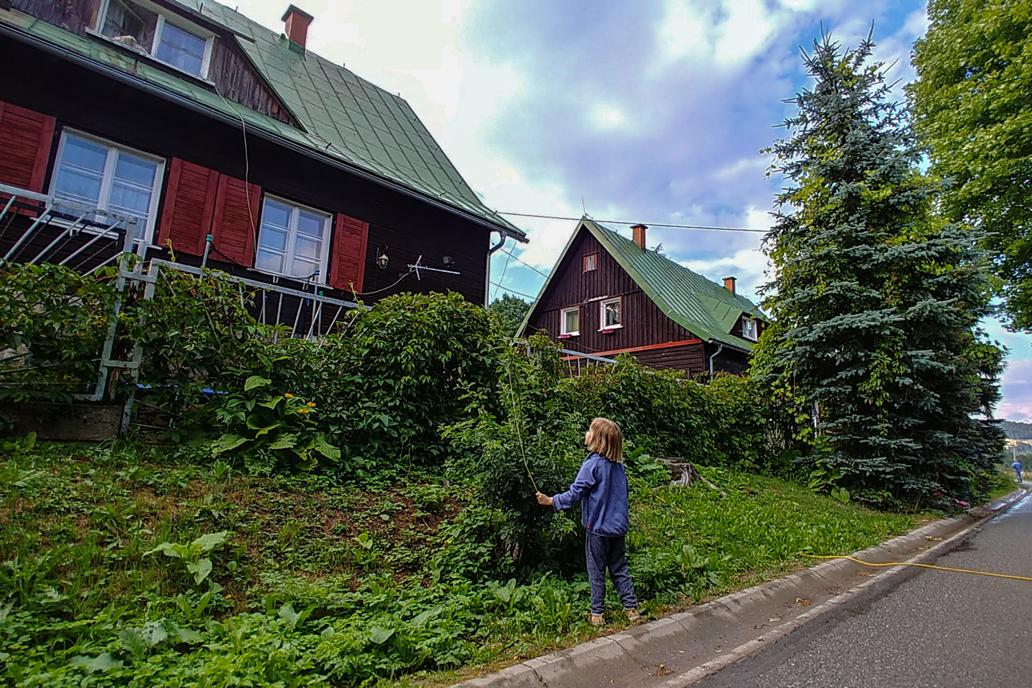 Ja byłam w ogromnym szoku, jak te góry zadziałały na Helenę. Po pierwsze przed wyjazdem powiedziała, że nie bierzemy nosidła. Co prawda nie chciało mi się do końca wierzyć, że to jest mądry wybór, no ale zaryzykowałam. Pierwszego dnia miałyśmy do przejścia trasę o długości niespełna 8 km (szlakiem czerwonym do granicy z Czechami, potem szlakiem żółtym, którego nie było pod Owczarkę, a potem niebieskim do schroniska). Trasę tę niezbyt żwawi turyści pokonują w 2h 20 min, nam to zajęło 4h 40 min. Szłyśmy dokładnie 2h 20 min, więc pozostałe 2 godziny musiałyśmy spędzić na odpoczynkach, poszukiwaniach kamieni i patyków, moczeniu kijków w strumyku czy w końcu próbie wynegocjowania tego, że idziemy dalej, odpowiadania na pytanie „Kiedy wracamy?” oraz tłumaczeniu, że decyzja o niezabraniu nosidła jest nieodwołalna, bo fizycznie go z nami nie ma. Naprawdę dużo mnie to kosztowało, zwłaszcza że nie było innej dorosłej osoby która, choć na chwilę przejęłaby marudzenie Heli.